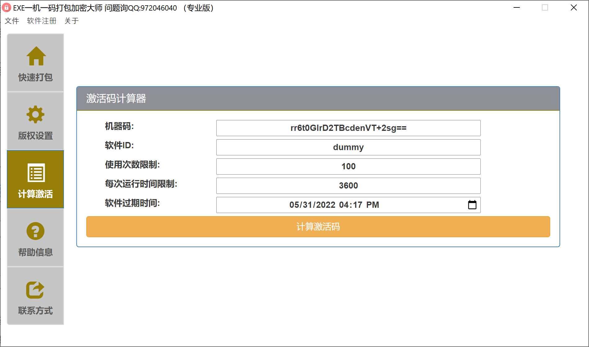2.用户可以把机器码复制粘贴给到开发人员,开发人员使用激活码计算器计算出相应的激活码